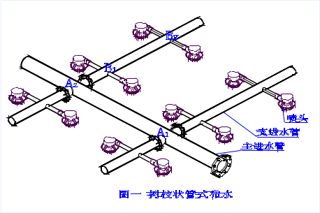 逆流冷卻塔循環(huán)水系統(tǒng)的布水方式采用管式布水,呈樹枝狀,循環(huán)水先進入主管,然后進入支管,再進入噴頭,主管、支管、噴頭相互垂直,如圖一。根據(jù)流體狀態(tài)方程:壓力(P)×流速(V)=常數(shù)(K),循環(huán)水從主管流經(jīng)A1點、A2點后,到達主管末端,由于冷卻塔布水需要主管末端是封閉的,因此流速(V)急劇下降,壓力(P)急劇上升,所以A2處比A1處水壓頭大,同理B2處比B1處水壓頭大,綜上分析各布水噴頭處的水壓頭不相